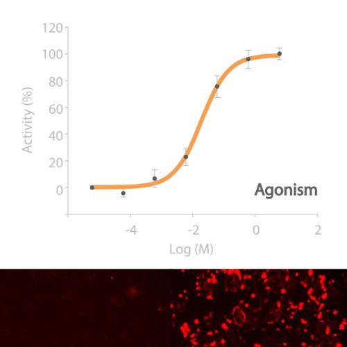 cAMP NOMAD FSHR Cell Line allows for the assay of compounds analyzing the G-Protein signaling pathway via cAMP, following activation of the receptor. When an agonist binds to FSHR, a G protein is activated which, in turn, triggers a cellular response mediated by cAMP. This leads to an increase in the red fluorescence intensity of cAMP biosensor. Thus, the activity can be easily quantified in living cells in a dose-response manner by fluorescence emission in a microplate reader.